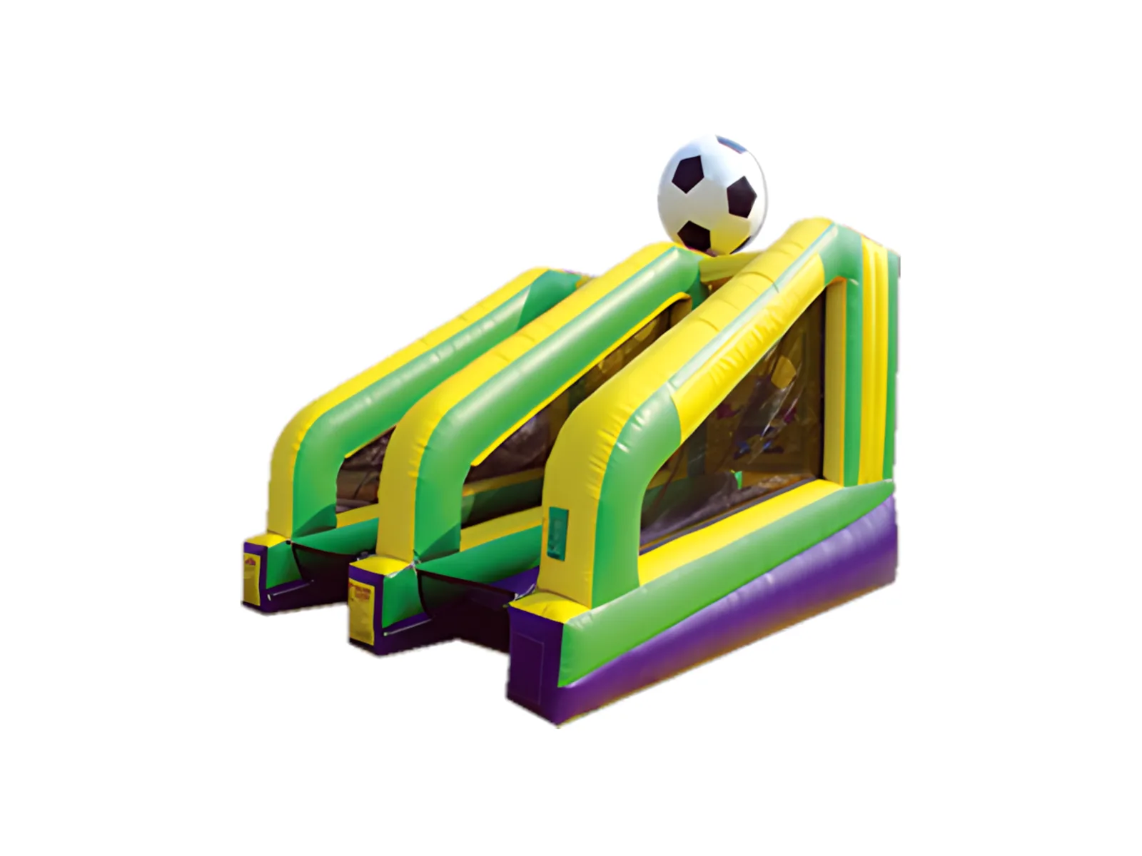 Penalty Kick Shootout is an interactive inflatable sports oriented game. Each player has a matching set of soccer balls. For example, one player has 2 red balls and the other has 2 blue balls. Players must kick (or throw) their balls into one of the holes at the back of their lane to have it go into their opponents lane. The first one to get all of the balls out of their lane wins. Since this game could go on for a long time, you can also play with a time limit. The winner could be the one with the least amount of balls in their lane after 2 minutes.