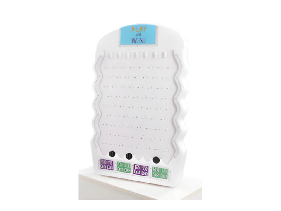 Featuring spaces for company logo and custom prize cards, drop a disk into the slot at the top and watch it move randomly down the column to the bottom. This carnival game includes everything needed to play and has spaces at the bottom where paper or cardboard cards indicating a prize won for that particular spot on the board can be slipped in. There are 4 positions at the bottom that measure approximately 4″ wide by 2″ high where cards can be inserted to indicate points or a prize won when a disk lands on that space. At the top of the Plinko game, there is a place where a card with a company logo or other message can be inserted as well. The top position measures approximately 8 3/4″ wide by 4″ high. The card slots on the bottom and the one at the top are optional and not required to play the game.