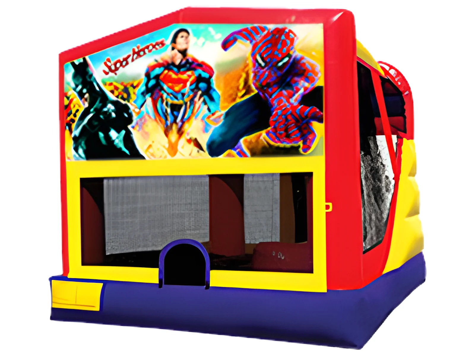 Featuring Batman, Superman and Spiderman, you’ll be the heroe with this themeable bounce and slide combo at your next party. Our Super Heroes combo is a “4 in 1” theme-able moon bounce and slide combo inflatable themed with popular Super Heroes. Inside all of our theme-able bounce-n-slide combos we include a large bouncing area, the climb to conquer, a fun and fast slide and a basketball hoop encouraging group play. At the entrance/exit there is an inflated safety step (not shown) to assist participants with getting in and out of the bounce house. High-visibility safety mesh on all sides of the inflatable allows for easier supervision of participants. Additionally, this inflatable bounce house is manufactured with lite n strong™, fire resistant vinyl for safety. Super Heroes combo can accommodate 6 to 8 children around the age of 6 years old (less for older/bigger children up to about age 12). Setup on grass is typical and always preferred as it tends to be the most secure but we can also set up on other surfaces such as asphalt or even inside. Be sure to let us know ahead of time if we won’t be setting up on grass.